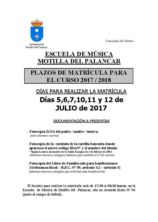 Hoy se han hecho públicos los plazos de matriculación para los cursos de natación este verano de 2017 y la Escuela de Música de Motilla del Palancar para el curso 2017/2018.