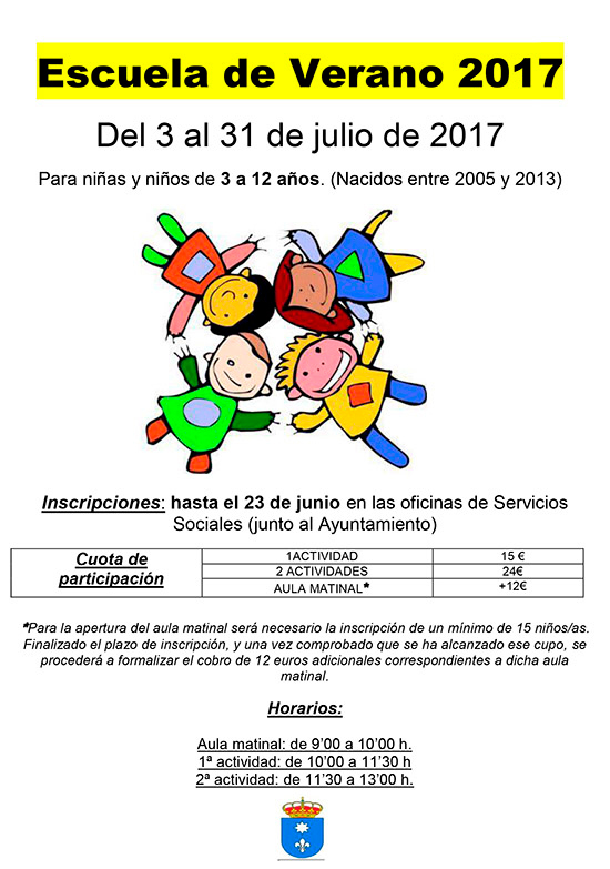 El plazo para apuntar a los niños y niñas de entre 3 y 12 años (Nacidos entre 2005 y 2013) está abierto hasta el día 23 de Junio en las oficinas de asuntos sociales (junto al ayuntamiento).