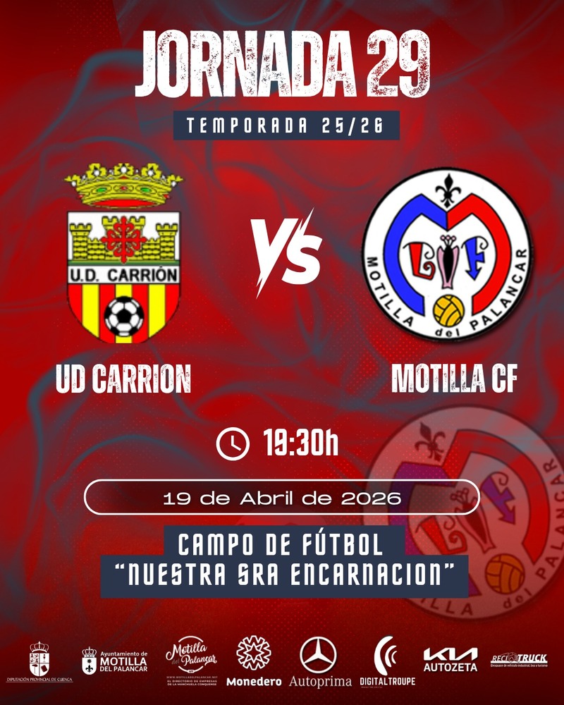 El Motilla CF se desplazará el domingo 19 de abril hasta Carrión para medirse a la UD Carrión en el Campo de Fútbol “Nuestra Señora de la Encarnación”, con inicio previsto a las 19:30 horas.