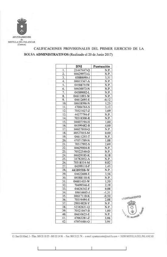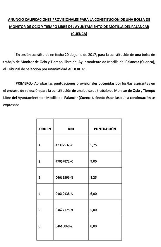 Ya han sido publicadas las calificaciones provisionales de las siguientes convocatorias a la bolsa de trabajo de Motilla del Palancar: