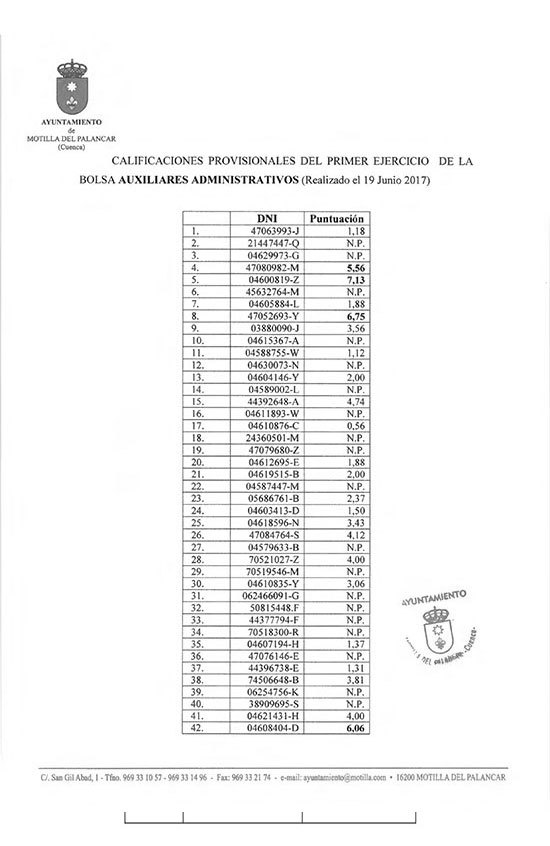 - Calificaciones Bolsa de Trabajo de Auxiliares Administrativos.