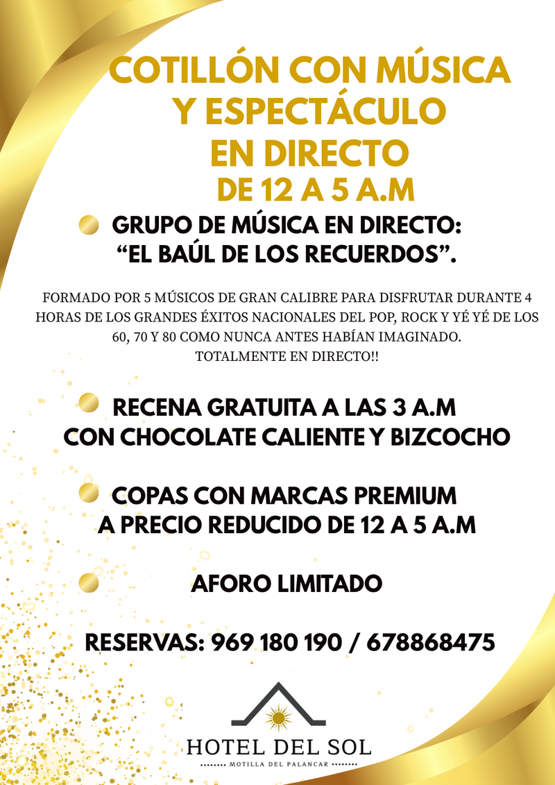 Tras la cena, el cotillón comenzará a medianoche y se prolongará hasta las 5 de la mañana. El evento contará con la actuación en directo del grupo “El Baúl de los Recuerdos”, formado por cinco músicos que interpretarán grandes éxitos nacionales del pop, rock y música ye-yé de los años 60, 70 y 80. La propuesta incluye recena gratuita con chocolate caliente y bizcocho a las 3:00 y copas con marcas premium a precio reducido. El aforo es limitado y, según el hotel, actualmente ya está cubierto el 60 % de la capacidad disponible.