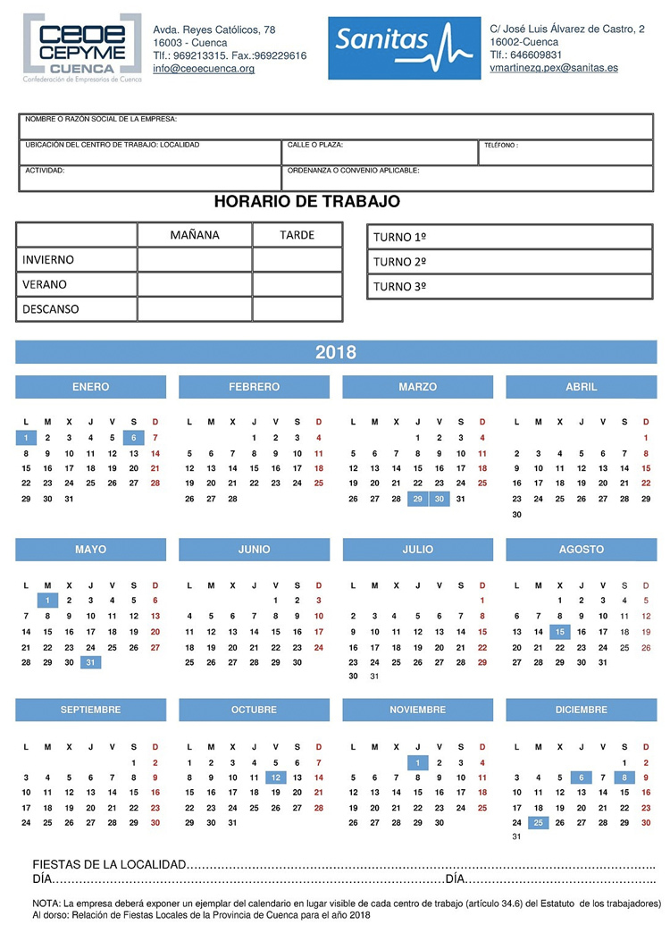 CEOE CEPYME Cuenca ha comunicado a sus empresas el Calendario Laboral que se ha establecido para el año 2018 y por el que podrán organizarse su trabajo durante este período, un documento que está patrocinado por Sanitas.