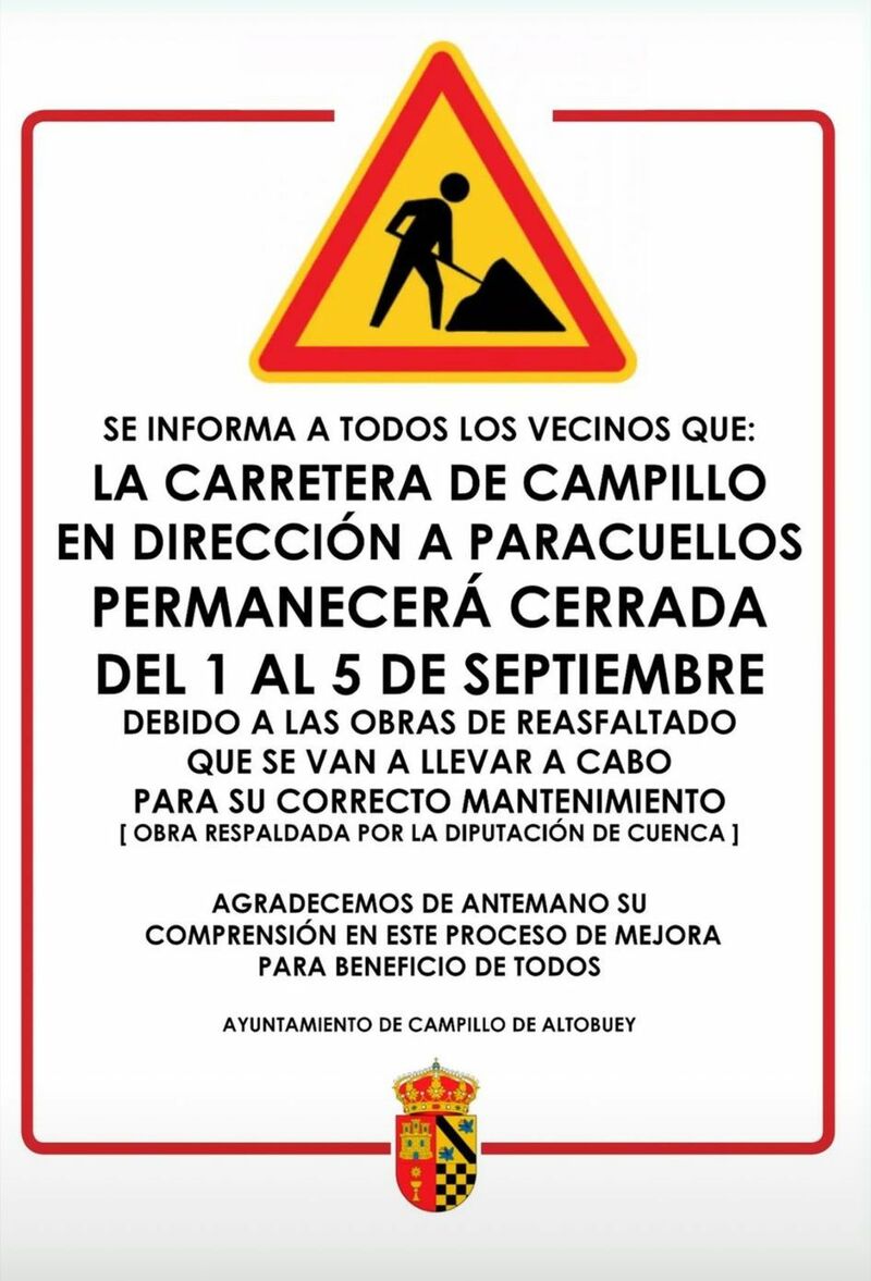 El Ayuntamiento de Campillo de Altobuey ha informado a los vecinos del cierre temporal de la carretera que conecta la localidad con Paracuellos.