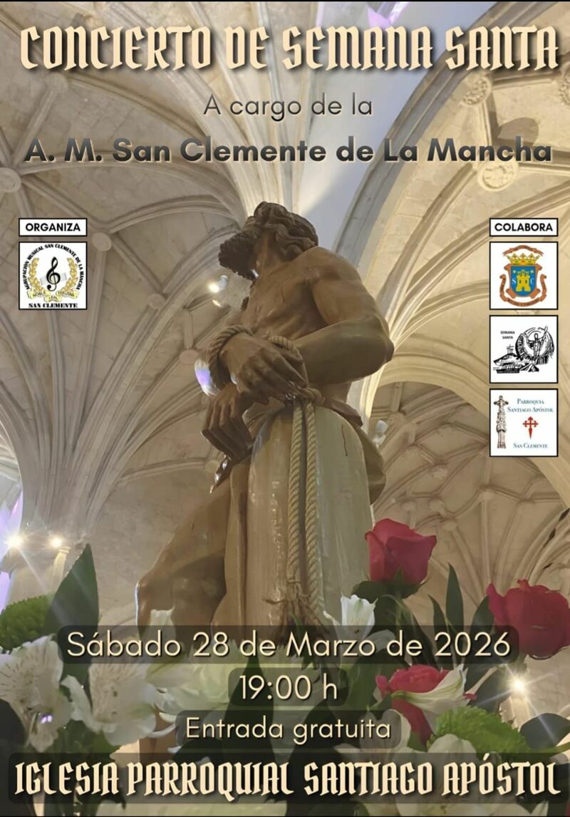 El sábado 28 de marzo, a las 19:00 horas, la Iglesia Parroquial Santiago Apóstol de San Clemente acogerá un Concierto de Semana Santa a cargo de la Agrupación Musical San Clemente de la Mancha.