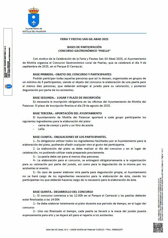 El Ayuntamiento de Motilla del Palancar ha convocado el tradicional concurso gastronómico de paellas dentro de la programación de la Feria y Fiestas de San Gil Abad 2025. La cita tendrá lugar el próximo jueves y ya se han publicado las bases de participación, plazos de inscripción y premios para los ganadores.