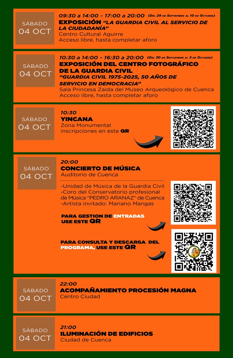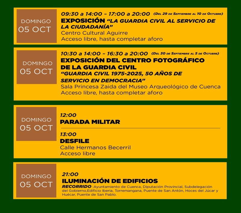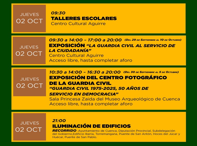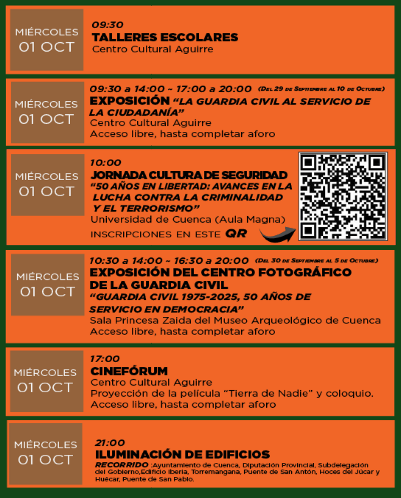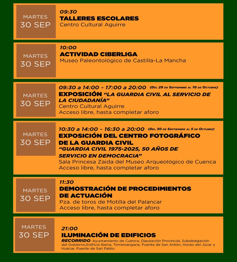 El martes 30 de septiembre se celebrarán talleres para escolares en el Centro Cultural Aguirre, la actividad “Ciberliga” en el Museo Paleontológico y la inauguración de la exposición fotográfica “Guardia Civil 1975-2025” en la sala Princesa Zaida del Museo de Cuenca. Ese mismo día, a las 11:30 horas, la Plaza de Toros de Motilla del Palancar acogerá una demostración de procedimientos de actuación abierta al público.