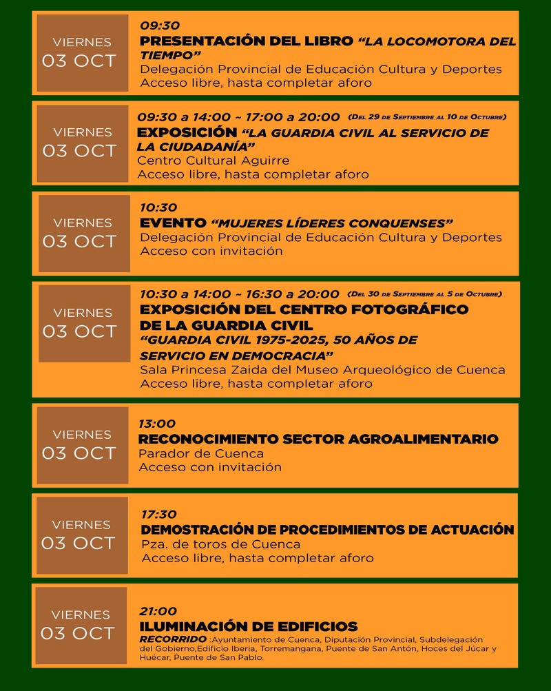 El viernes 3 de octubre se abrirá con la presentación del libro La locomotora del tiempo y el encuentro “Mujeres líderes conquenses”, ambos en la Delegación Provincial de Educación, Cultura y Deportes. Al mediodía tendrá lugar un reconocimiento al sector agroalimentario en el Parador de Cuenca y, por la tarde, la plaza de toros de la capital acogerá una nueva exhibición de procedimientos de actuación de la Guardia Civil.