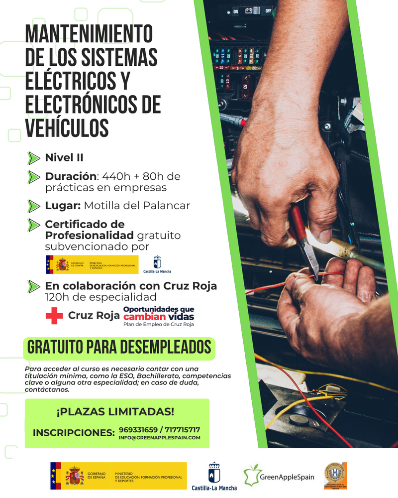Green Apple Spain ha anunciado la puesta en marcha del curso “Mantenimiento de los sistemas eléctricos y electrónicos de vehículos” (Nivel II), una formación 100% subvencionada por la Junta de Comunidades de Castilla-La Mancha y el Ministerio de Educación, Formación Profesional y Deportes. Este curso gratuito está destinado a personas desempleadas y se impartirá en Motilla del Palancar a partir del 19 de noviembre.