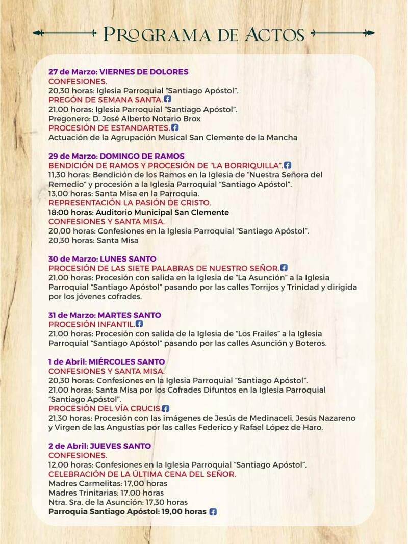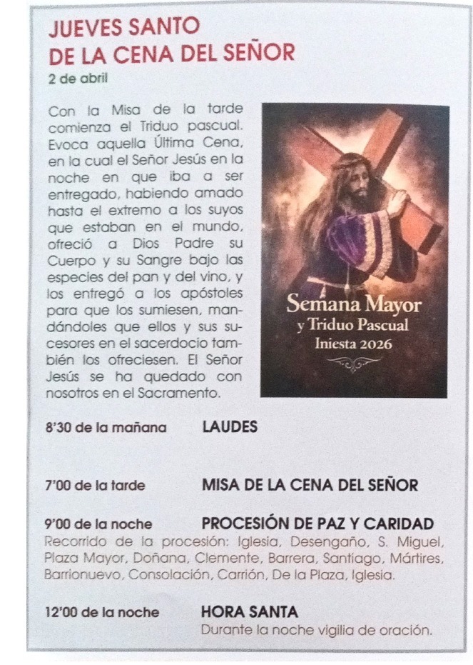 En Las Pedroñeras, el Jueves Santo incluye la Misa de la Cena del Señor a las 18:00 horas.