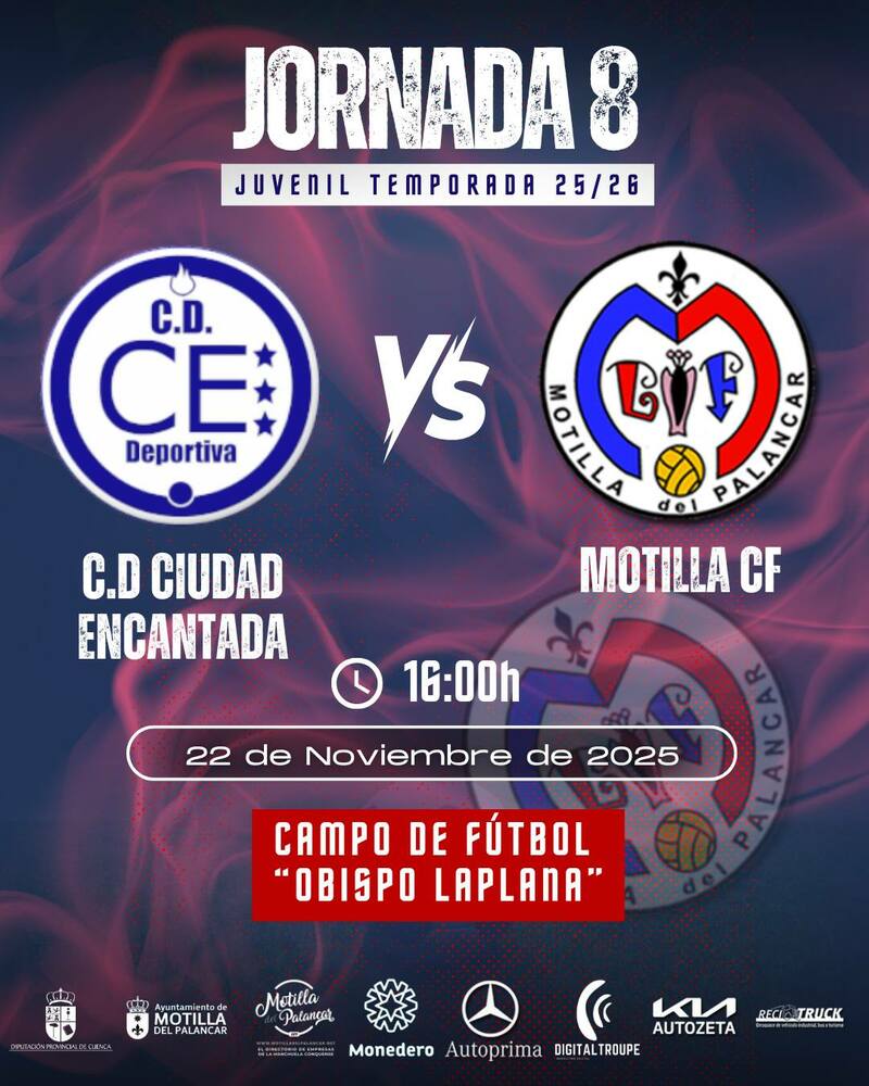 El equipo juvenil del Motilla CF viajará a Cuenca para medirse al CD Ciudad Encantada B el sábado 22 de noviembre a las 16:00 horas en el Campo Obispo Laplana. Los juveniles atraviesan un gran momento tras su victoria por 2-0 frente al Atlético Tarazona, resultado que les mantiene en la tercera posición con 16 puntos y en plena lucha por el liderato.