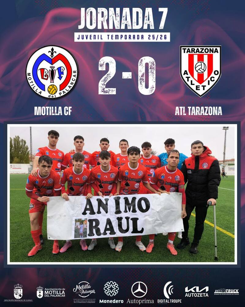 El Juvenil del Motilla C.F. volvió a demostrar su gran momento de forma y sumó una nueva victoria, esta vez como local, tras imponerse por 2-0 al Atlético Tarazona en el encuentro correspondiente a la jornada 7, disputado el 15 de noviembre a las 16:00 horas en el Campo de Fútbol “Kike García”.