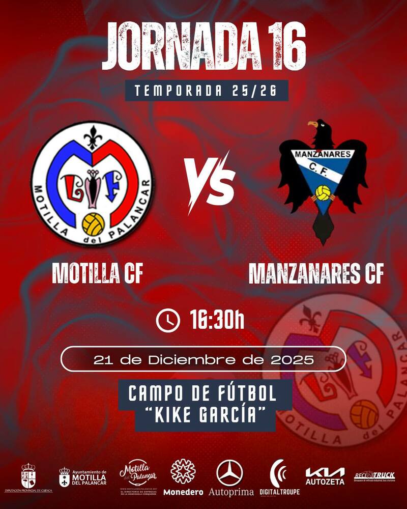 El Motilla CF disputará este domingo, 21 de diciembre de 2025, a las 16:30 horas, el decimosexto partido de la temporada frente al Manzanares CF. El encuentro se celebrará en el Campo de Fútbol Kike García y supondrá el último compromiso del año para el conjunto motillano. El equipo recibe al segundo clasificado con la necesidad de sumar tres puntos y cerrar el año con una victoria, tras la derrota por 2-1 ante la U.D. Almansa en la pasada jornada, resultado que mantiene al Motilla CF con 20 puntos en la décima posición de la clasificación.
