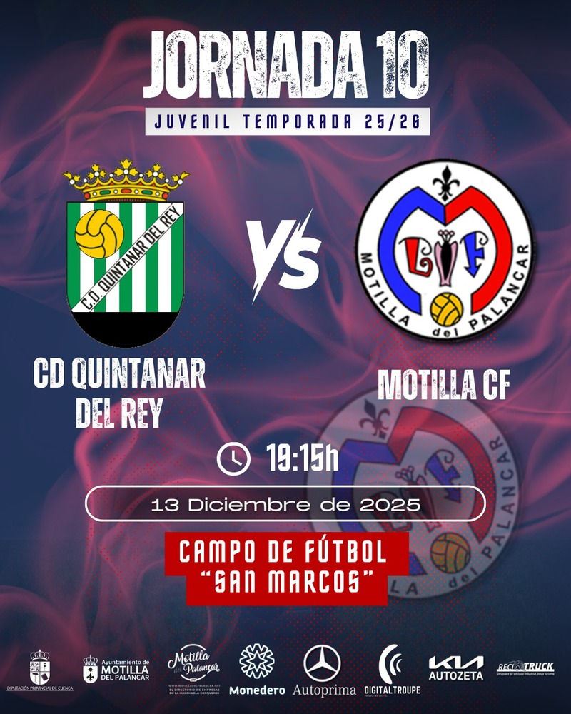El equipo juvenil del Motilla CF se desplazará este sábado 13 de diciembre al Campo de Fútbol “San Marcos” para enfrentarse al CD Quintanar del Rey, en partido correspondiente a la jornada 10, que comenzará a las 19:15 horas. Se trata de un encuentro exigente ante un rival directo, con la intención de mantener la condición de invictos y seguir en la lucha por el liderato.