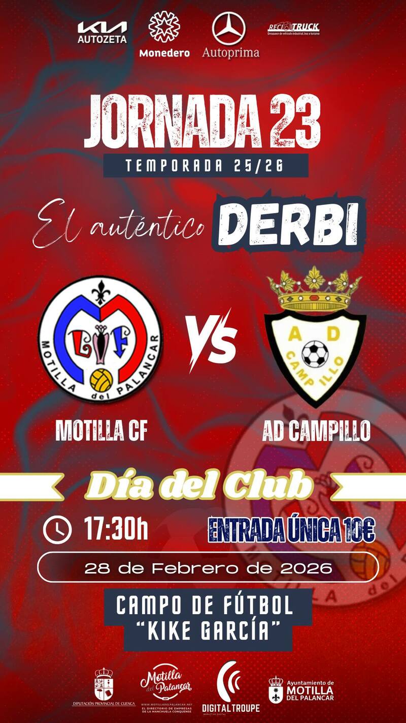 Motilla del Palancar volverá a vivir este sábado 28 de febrero una de esas fechas señaladas en el calendario deportivo local. El Campo de Fútbol “Kike García” acogerá desde las 17:30 horas el esperado derbi entre el Motilla CF y la AD Campillo, en una jornada declarada Día del Club que combinará fútbol, convivencia y ambiente festivo.