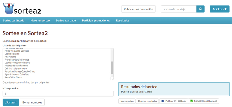 Adjuntamos pantallazo del sorteo, realizado en Sortea2.com: