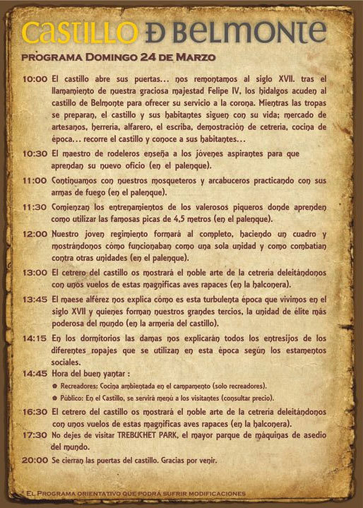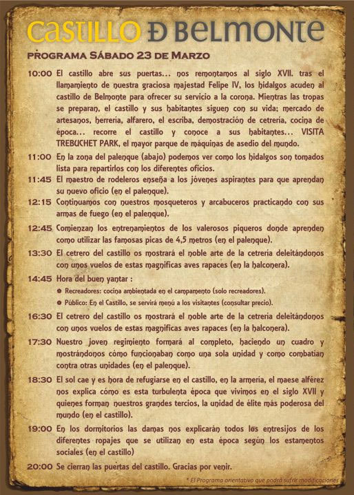 El Castillo de Belmonte se complace en anunciar las II Jornadas de recreación Histórica en el Castillo de Belmonte que se celebran los días 23 y 24 de marzoy que este año están dedicadas a los “Tercios de España s. XVII”. Las Jornadas tendrán lugar en el recinto amurallado del castillo con una extensión de 70.000 m2 y un marco histórico incomparable. Nos remontaremos al siglo XVII viendo como entrenaban mosqueteros y arcabuceros con sus armas de fuego mientras los valerosos piqueros practican con las famosas picas de 4,5 metros de longitud.