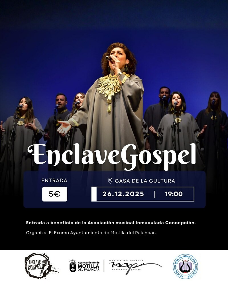 La música gospel será la protagonista en Motilla del Palancar el próximo 26 de diciembre, con la actuación de Enclave Gospel en la Casa de la Cultura, a partir de las 19:00 horas. El concierto contará con una entrada solidaria de 5 euros, cuya recaudación irá destinada a la Asociación Musical Inmaculada Concepción, en una cita que combina cultura, emoción y apoyo a la música local.