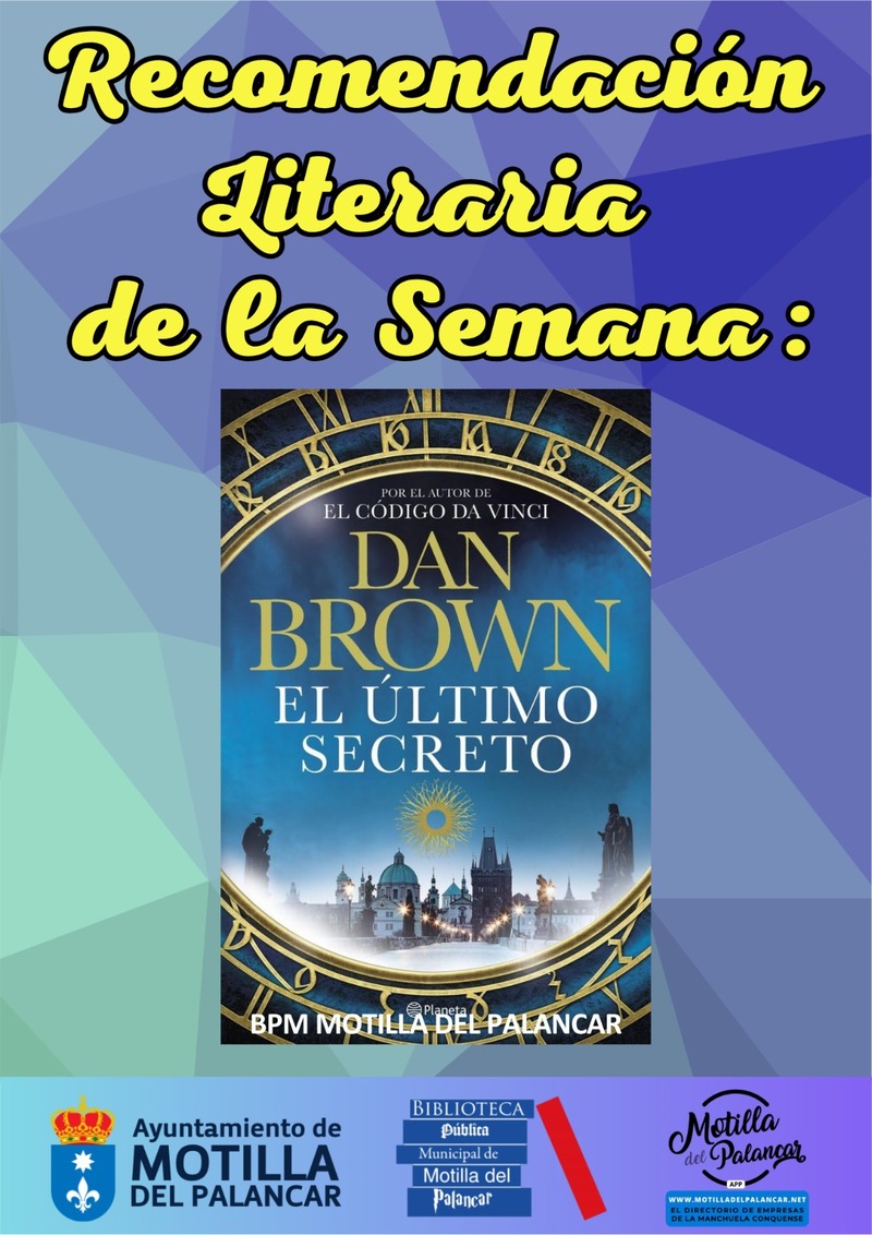 La recomendación de esta semana es una novedad que lleva muy poquito tiempo en la Biblioteca de Motilla del Palancar y va recomendada a nuestros lectores adultos, amantes de la buena novela de intriga y suspense: se trata de “El último secreto”, el último trabajo publicado hasta la fecha de Dan Brown, escritor mundialmente conocido y leído por millones y millones de lectores en todo el mundo y aclamado tanto por la crítica especializada como por el público.