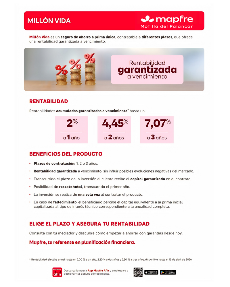 Ahorrar sin sobresaltos y con beneficios garantizados ya es posible en Motilla. La oficina de Mapfre Motilla del Palancar presenta “Millón Vida”, un seguro de ahorro diseñado para quienes quieren hacer crecer su dinero con tranquilidad, sin depender de los vaivenes del mercado.