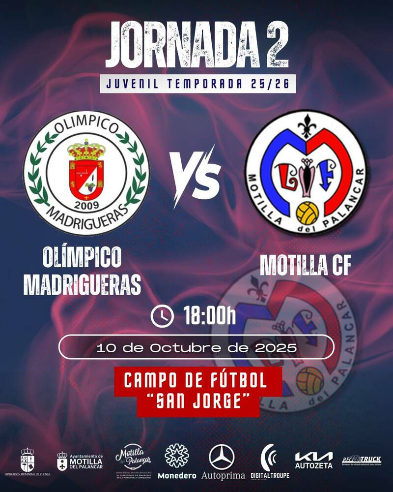 El equipo juvenil del Motilla CF disputará su segundo partido fuera de casa este viernes 10 de octubre a las 18:00 horas ante el Olímpico de Madrigueras, en el Campo de Fútbol “San Jorge”.