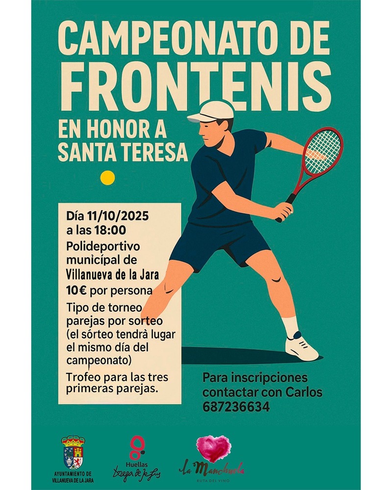 Dentro de las Fiestas de Santa Teresa 2025, Villanueva de la Jara organiza el Campeonato de Frontenis este sábado 11 de octubre a las 18:00 horas en el Polideportivo Municipal.