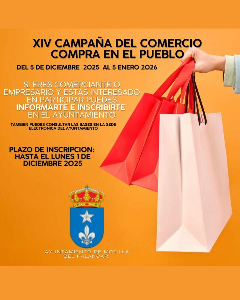 El Ayuntamiento de Motilla del Palancar ha anunciado la puesta en marcha de la XIV Campaña del Comercio “Compra en el Pueblo”, una iniciativa que se celebrará del 5 de diciembre de 2025 al 5 de enero de 2026 para impulsar el comercio local y fomentar las compras en el municipio.