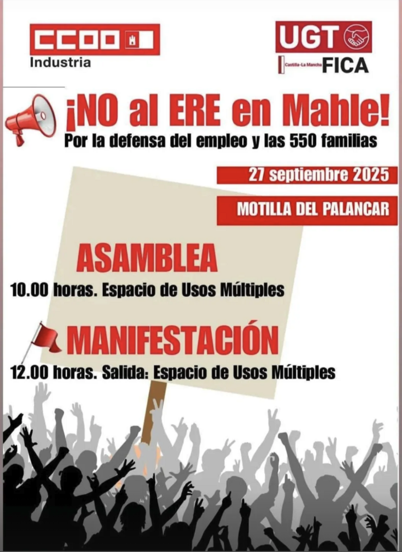 El Comité de Empresa de Mahle ha anunciado una doble convocatoria para el sábado 27 de septiembre en Motilla del Palancar, en respuesta al ERE presentado por la compañía.