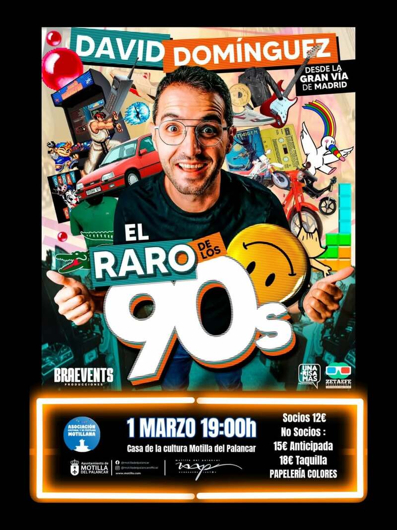 También el domingo 1 de marzo, pero a las 19:00 horas, la Casa de la Cultura de Motilla del Palancar recibirá al cómico David Domínguez con su monólogo “El raro de los 90’s”.