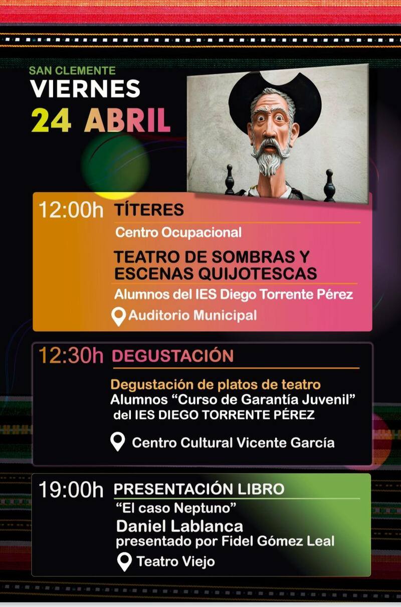 La agenda cultural del fin de semana del 24 al 26 de abril llega con propuestas variadas en distintos municipios de la comarca. Teatro, música en directo, cine, actividades tecnológicas, ferias y gastronomía forman parte de una programación pensada para todos los públicos en localidades como Motilla del Palancar, Quintanar del Rey, Iniesta, Casas Ibáñez, San Clemente, Villanueva de la Jara y El Peral.
