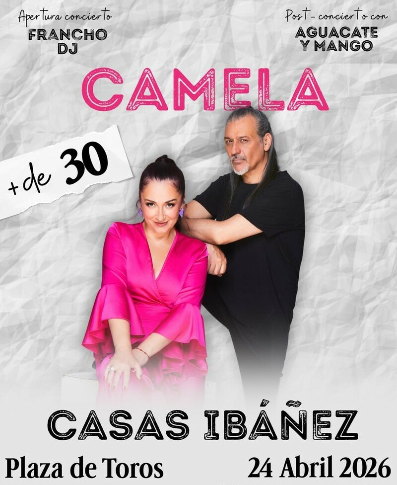 El viernes 24 de abril llega el concierto de Camela, dentro de su gira +30. El evento se celebrará en la Plaza de Toros, con apertura de puertas a las 22:00 horas, incluyendo sesión previa con Francho DJ y música posterior con Aguacate y Mango.
