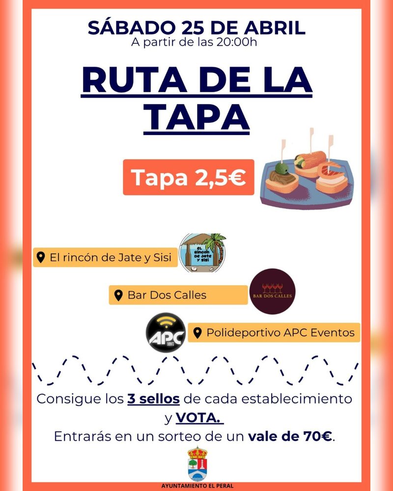 El Peral acoge el sábado 25 de abril su Ruta de la Tapa, a partir de las 20:00 horas, con tapas al precio de 2,5 euros en los establecimientos: