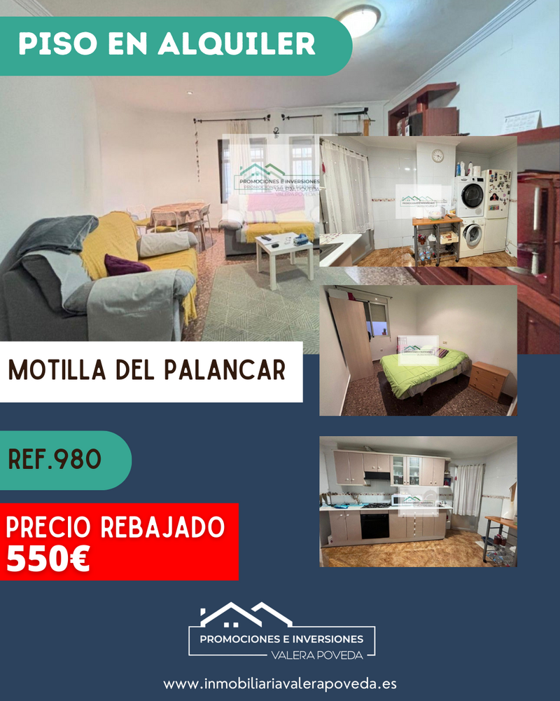 Además de inmuebles en venta, Valera Poveda también dispone de oportunidades de alquiler. En este caso, se ofrece un piso en alquiler en Motilla del Palancar, con precio rebajado de 550 euros al mes. La vivienda cuenta con 100 metros cuadrados, dispone de tres habitaciones y dos baños, e incluye terraza. Se trata de una alternativa muy atractiva para quienes buscan alquilar una vivienda amplia, funcional y lista para entrar a vivir en la localidad.