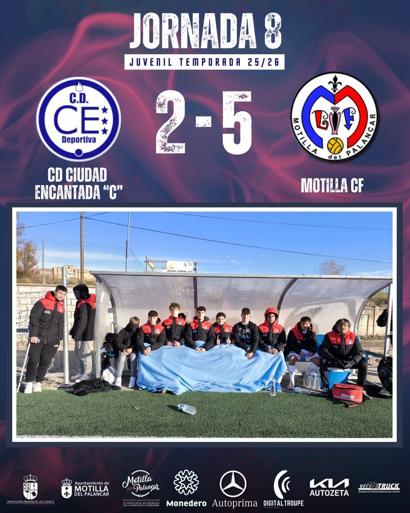 El juvenil del Motilla C.F. volvió a firmar un gran encuentro y prolongó su excelente racha de resultados tras imponerse por 2-5 al CD Ciudad Encantada en el partido correspondiente a la jornada 8, disputado el 22 de noviembre de 2025, a las 16:00 horas en el Campo de Fútbol “Obispo Laplana” de Cuenca.