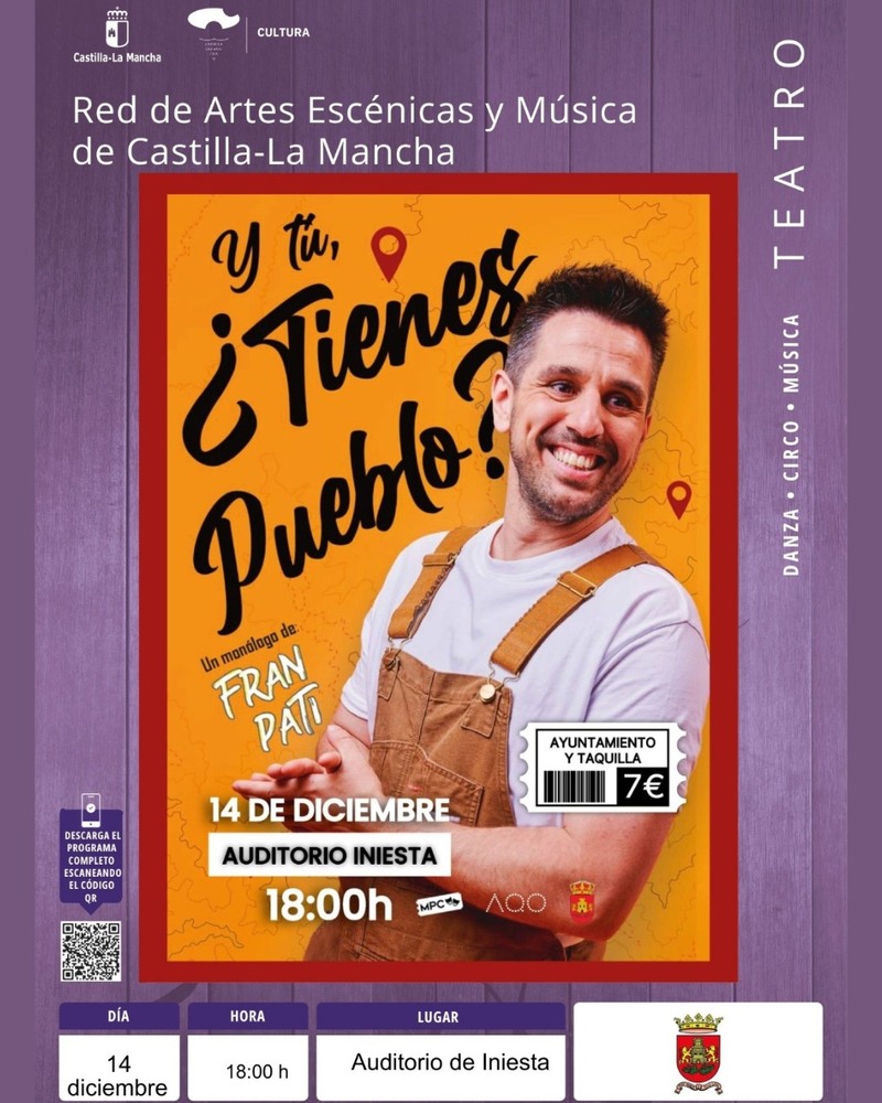 El Auditorio Municipal acogerá el domingo 14 de diciembre, a las 18:00 horas, el monólogo “¿Y tú, tienes pueblo?”, protagonizado por Fran Pati. El espectáculo combina humor y anécdotas rurales. Las entradas tienen un precio de 7 euros y pueden adquirirse en el Ayuntamiento y en taquilla el mismo día de la función.