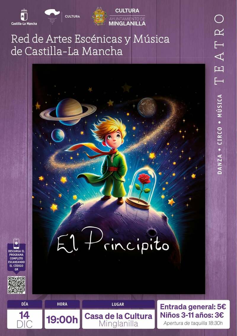 La Casa de la Cultura acogerá el domingo 14 de diciembre, a las 19:00 horas, el espectáculo “El Principito”, una adaptación teatral del conocido relato dirigida a público familiar. Las entradas tendrán un precio de 5 euros para el público general y 3 euros para niños de 3 a 11 años, con apertura de taquilla a las 18:30 horas. Además, el sábado 13 de diciembre, a las 18:00 horas, se celebrará un concierto de la Sociedad Musical Amics de la Música de Meliana, con entrada gratuita.