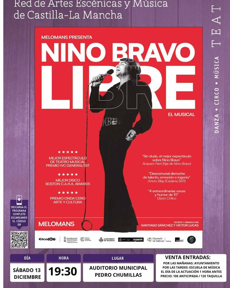 El Auditorio Municipal Pedro Chumillas acogerá el sábado 13 de diciembre, a las 19:30 horas, el musical “Nino Bravo: Libre”, un espectáculo que recorre la vida y trayectoria artística del cantante. El montaje ha sido reconocido con varios premios y combina música, interpretación y una cuidada puesta en escena. Las entradas tienen un precio de 10 euros en venta anticipada y 12 euros en taquilla.