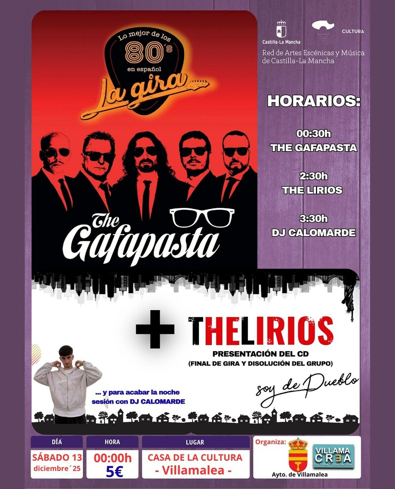 El programa Diciembre Cultural 2025 de Villamalea incluye varias citas durante el fin de semana. El sábado 13 de diciembre, a las 19:00 horas, se celebrará una zambomba flamenca-navideña en la Plaza de la Iglesia, con venta solidaria de castañas y dulces. Esa misma noche, a partir de las 00:00 horas, la Casa de la Cultura acogerá un concierto con The Gafapasta, The Lirios y DJ Calomarde, con entrada a 5 euros. El domingo 14 de diciembre, a las 19:30 horas, el Auditorio Municipal será escenario de un concierto-homenaje a Chaplin a cargo de la Unión Musical de Villamalea, también con entrada de 5 euros.