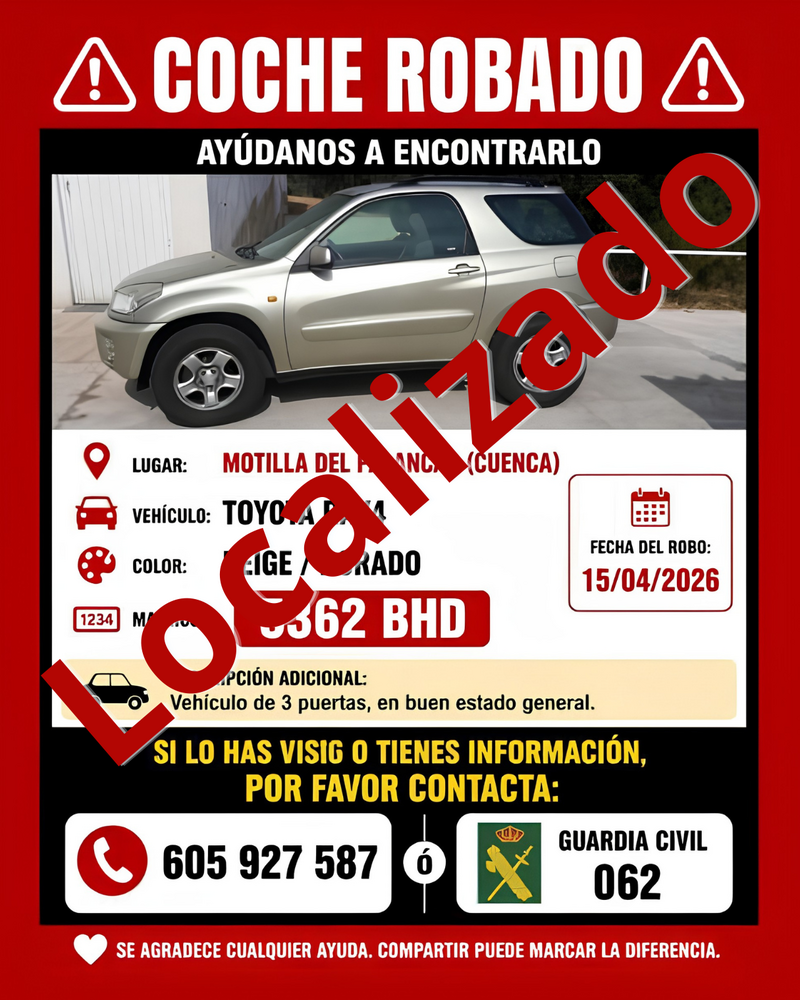 La seguridad vuelve a estar en el foco en Motilla del Palancar tras el nuevo robo de un vehículo en la localidad. En este caso, se trata de un Toyota RAV4 de color beige/dorado, sustraído el pasado 15 de abril.