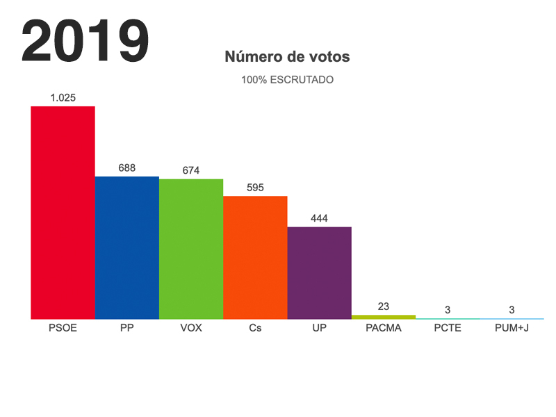PSOE ha conseguido el mayor número de votos (1.025 votos) seguido por PP, VOX y Cs.