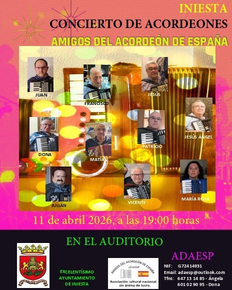 La música será protagonista en Iniesta el sábado 11 de abril a las 19:00 horas con el concierto de la asociación nacional ADAESP (Amigos del Acordeón de España) en el Auditorio Municipal.