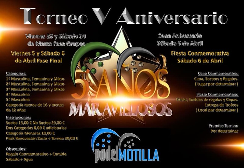 Durante los fines de semana del 29, 30 de Marzo y 5 y 6 de Abril se celebra en las instalaciones de Padelmotilla el Torneo V Aniversario.