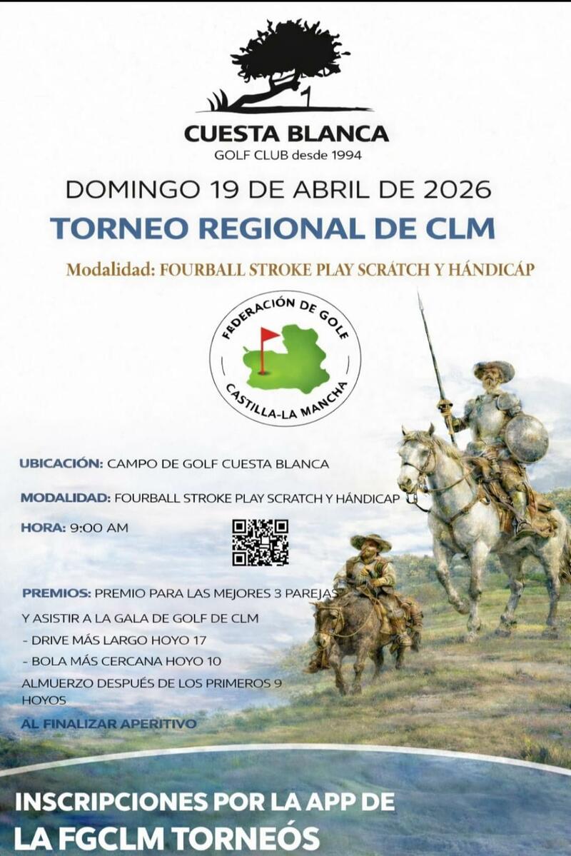 El próximo domingo 19 de abril de 2026 se celebra el esperado Torneo Regional de Castilla-La Mancha (CLM) en el Campo de Golf Cuesta Blanca, una cita destacada para los aficionados al golf de la provincia de Cuenca y municipios cercanos. La competición, organizada por la Federación de Golf de CLM, se disputará en modalidad por parejas y promete una jornada deportiva y social de gran nivel.