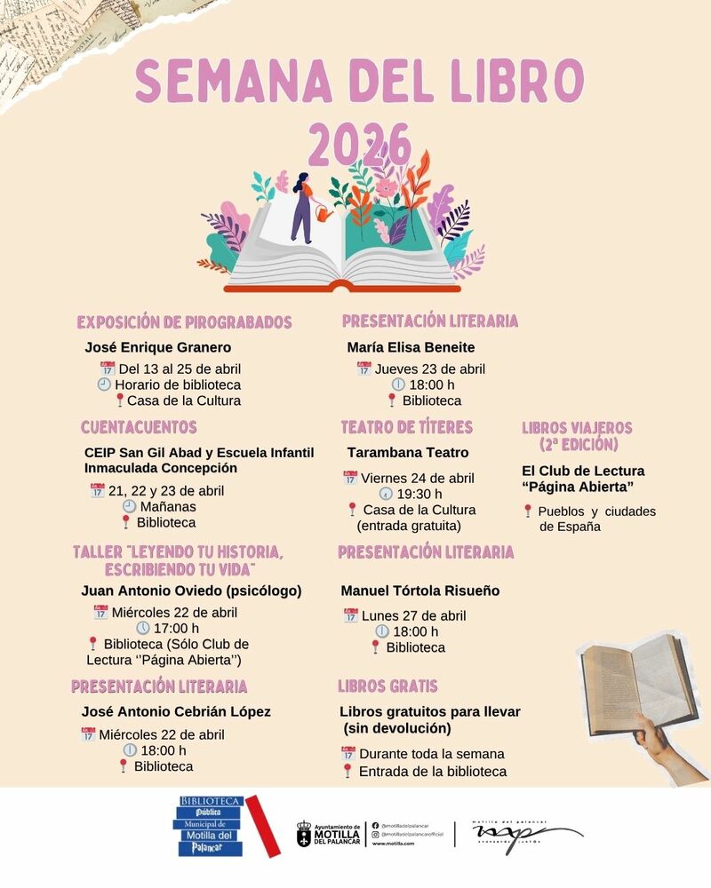 Motilla del Palancar vuelve a ofrecer propuestas para todos los públicos, con una agenda reforzada por la celebración de la Semana del Libro 2026, que incluye actividades culturales y de fomento de la lectura durante estos días.