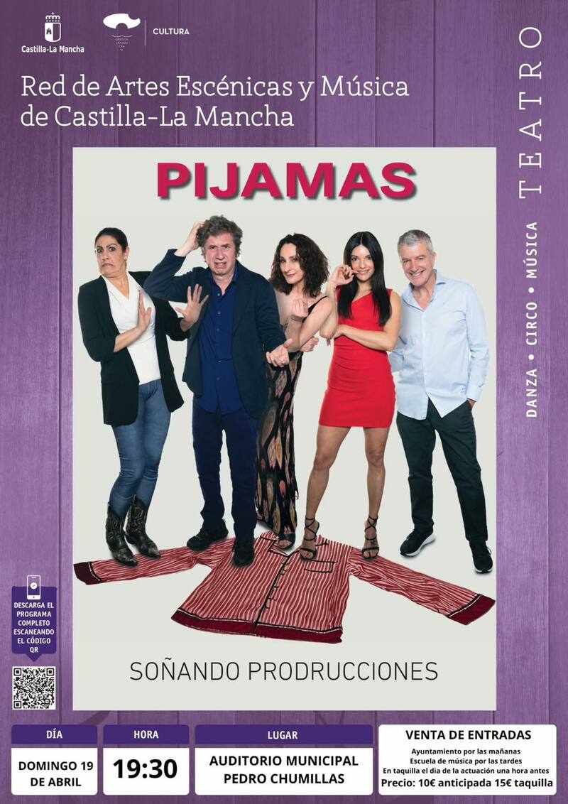 El domingo 19 de abril, el teatro continúa en la comarca con la comedia “Pijamas”, que se representará en Quintanar del Rey a las 19:30 horas en el Auditorio Municipal Pedro Chumillas.