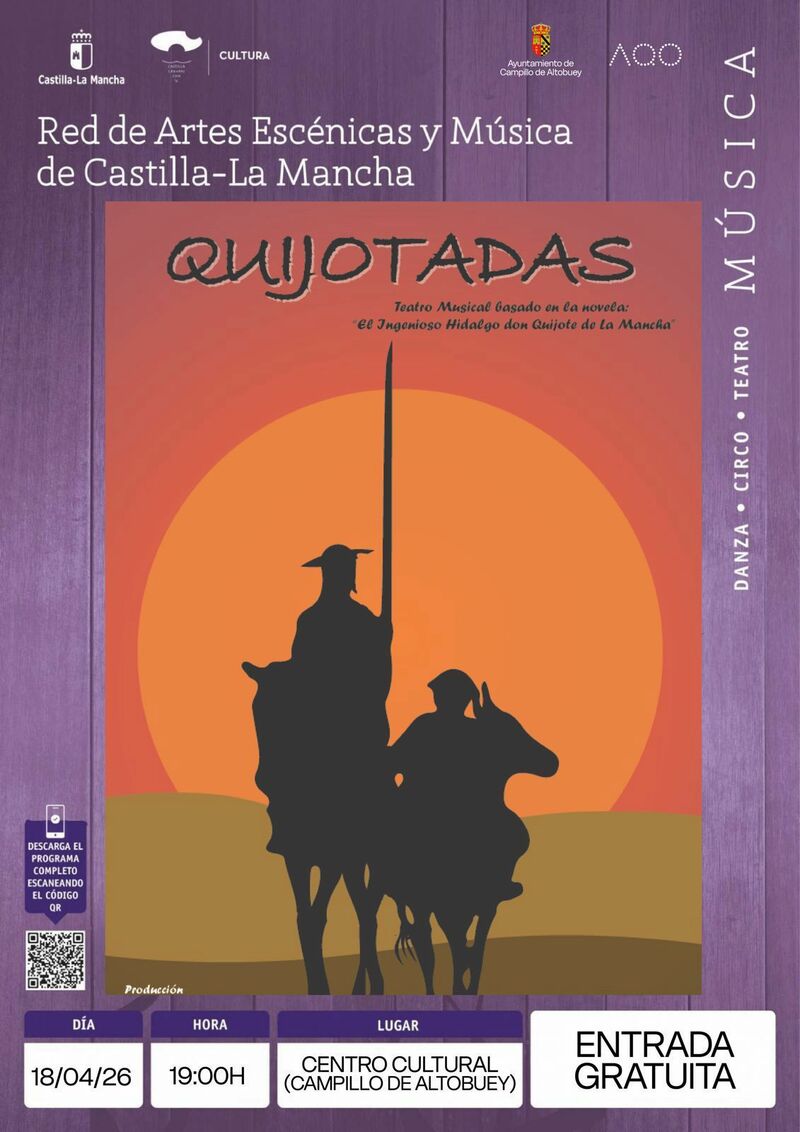 Campillo de Altobuey se suma a la agenda cultural del fin de semana con una propuesta escénica para todos los públicos. El sábado 18 de abril a las 19:00 horas, el Centro Cultural acoge “Quijotadas”, un espectáculo de teatro musical inspirado en El ingenioso hidalgo Don Quijote de la Mancha.