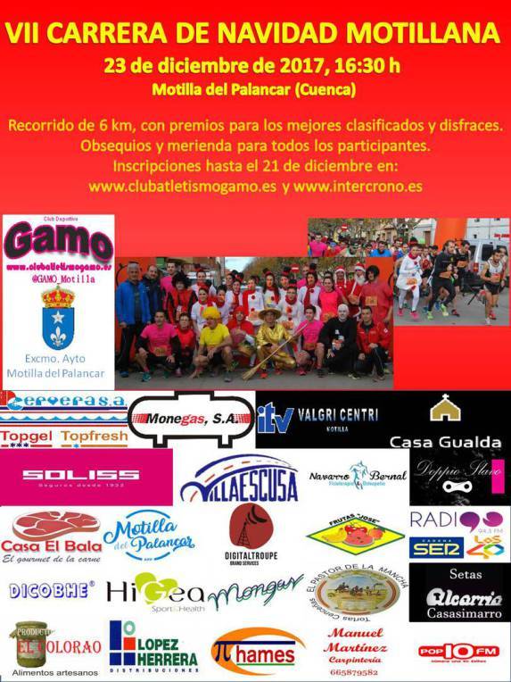 El Club Atletismo GAMO organiza la VII Carrera de Navidad Motillana, que se celebrará del día 23 de diciembre de 2017 a las 16:30 horas en la Av. Del Riato y en la que podrá tomar parte cualquier persona mayor de 18 años.