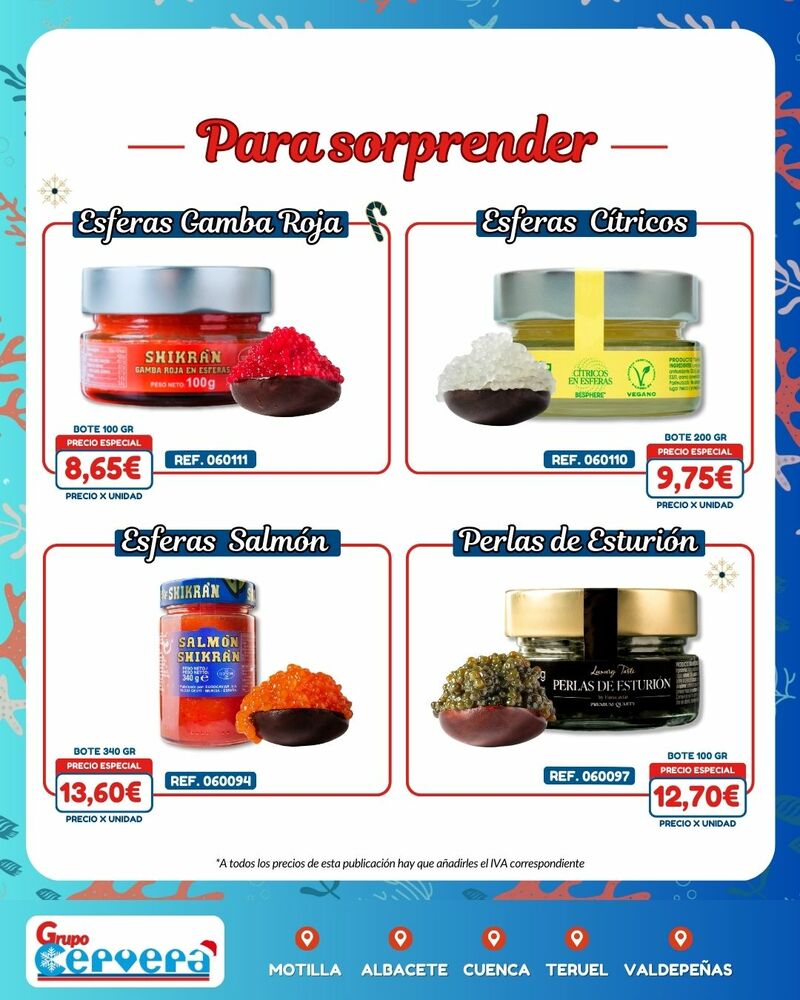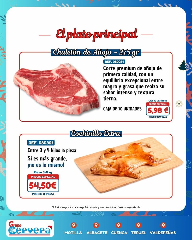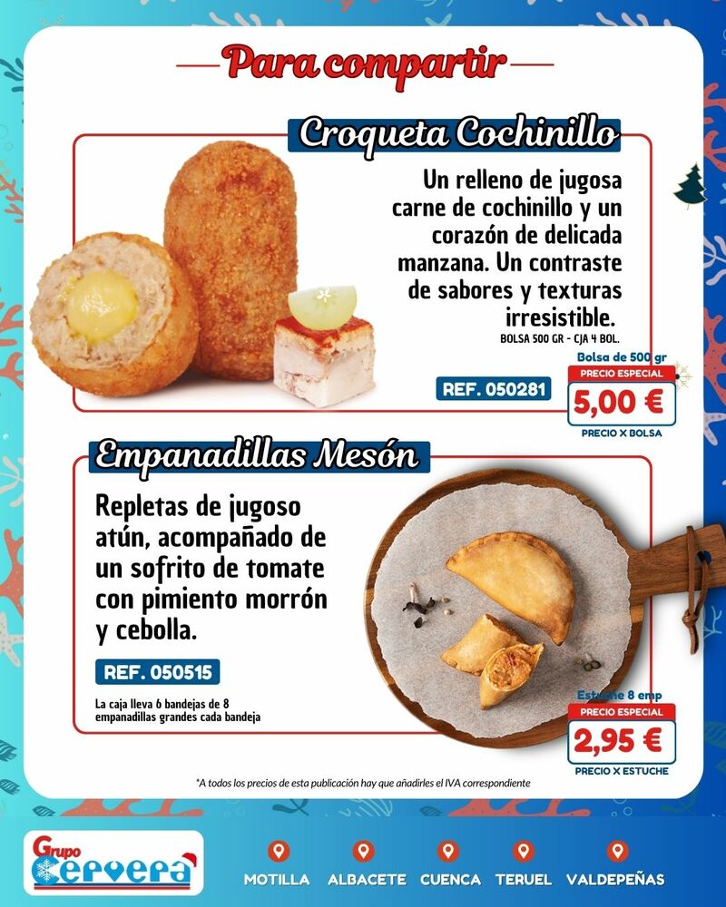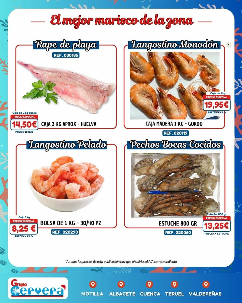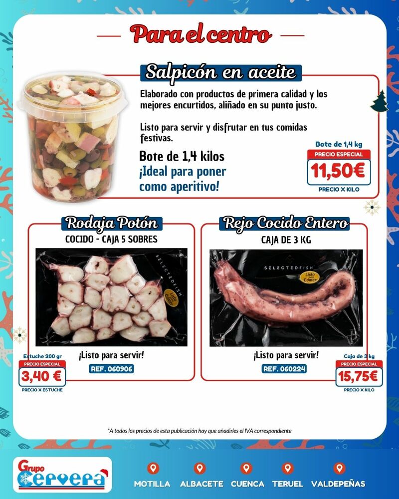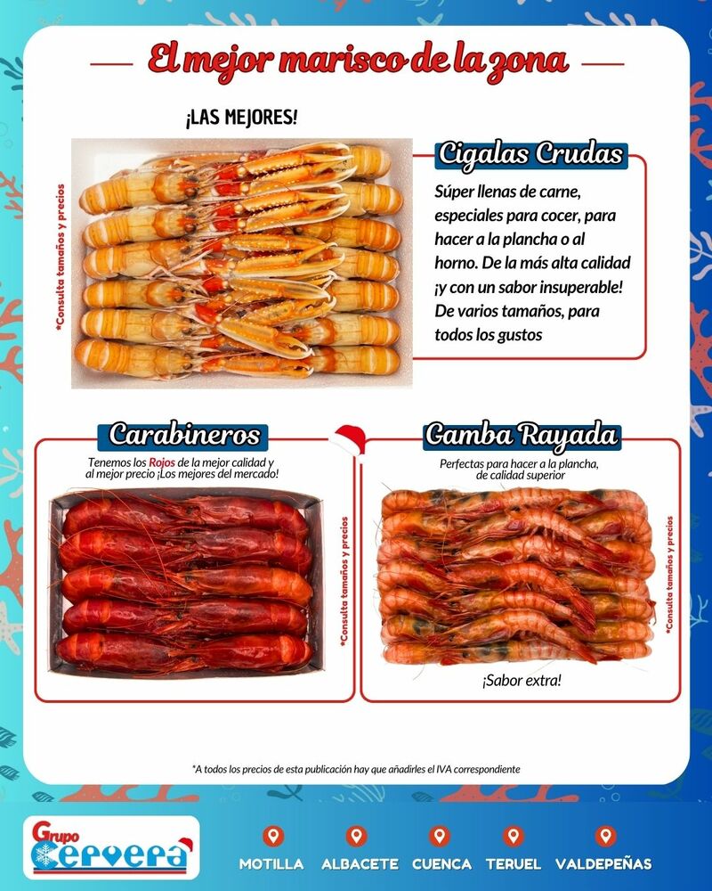 Grupo Cervera lanza su catálogo especial de Navidad con una amplia variedad de mariscos, pescados, carnes, precocinados y productos gourmet a precios competitivos. La empresa, con sede Motilla, Albacete, Cuenca, Teruel y Valdepeñas, anima a adelantar las compras para evitar subidas de precios y asegurar disponibilidad en unas fechas clave para la hostelería y las familias de la provincia.