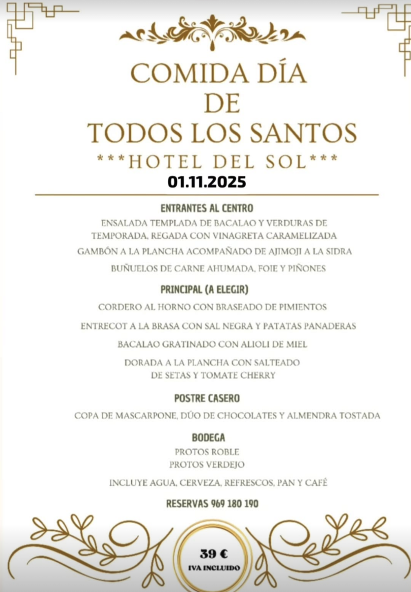 El Hotel del Sol ofrecerá este 1 de noviembre de 2025 una comida especial con motivo del Día de Todos los Santos, pensada para quienes deseen disfrutar de la mejor cocina local en un ambiente acogedor.