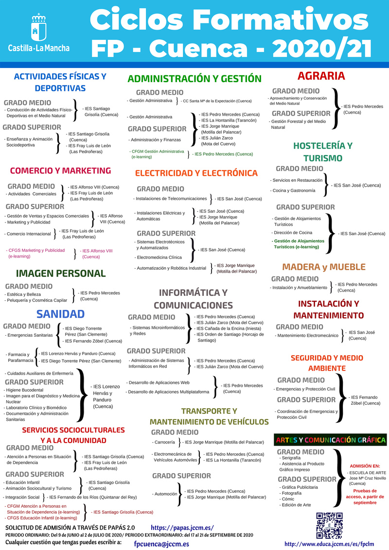 A continuación puedes consultar los diferentes Ciclos Formativos que se imparten en Motilla del Palancar y en toda la provincia de Cuenca.